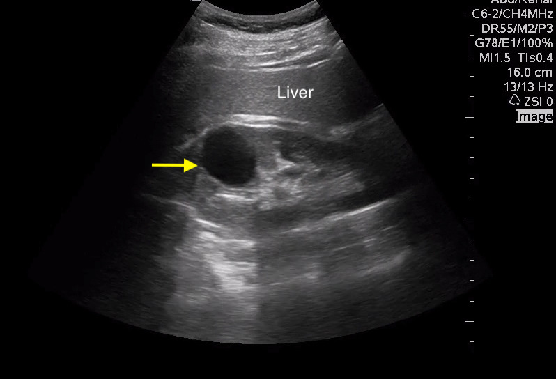 Figure 2. Point-of-care ultrasound example of a simple renal cyst in the right kidney. This figure is useful because it reinforces the same simple-cyst pattern in a practical bedside ultrasound setting: oval fluid content, no internal complexity, and posterior enhancement. Source: